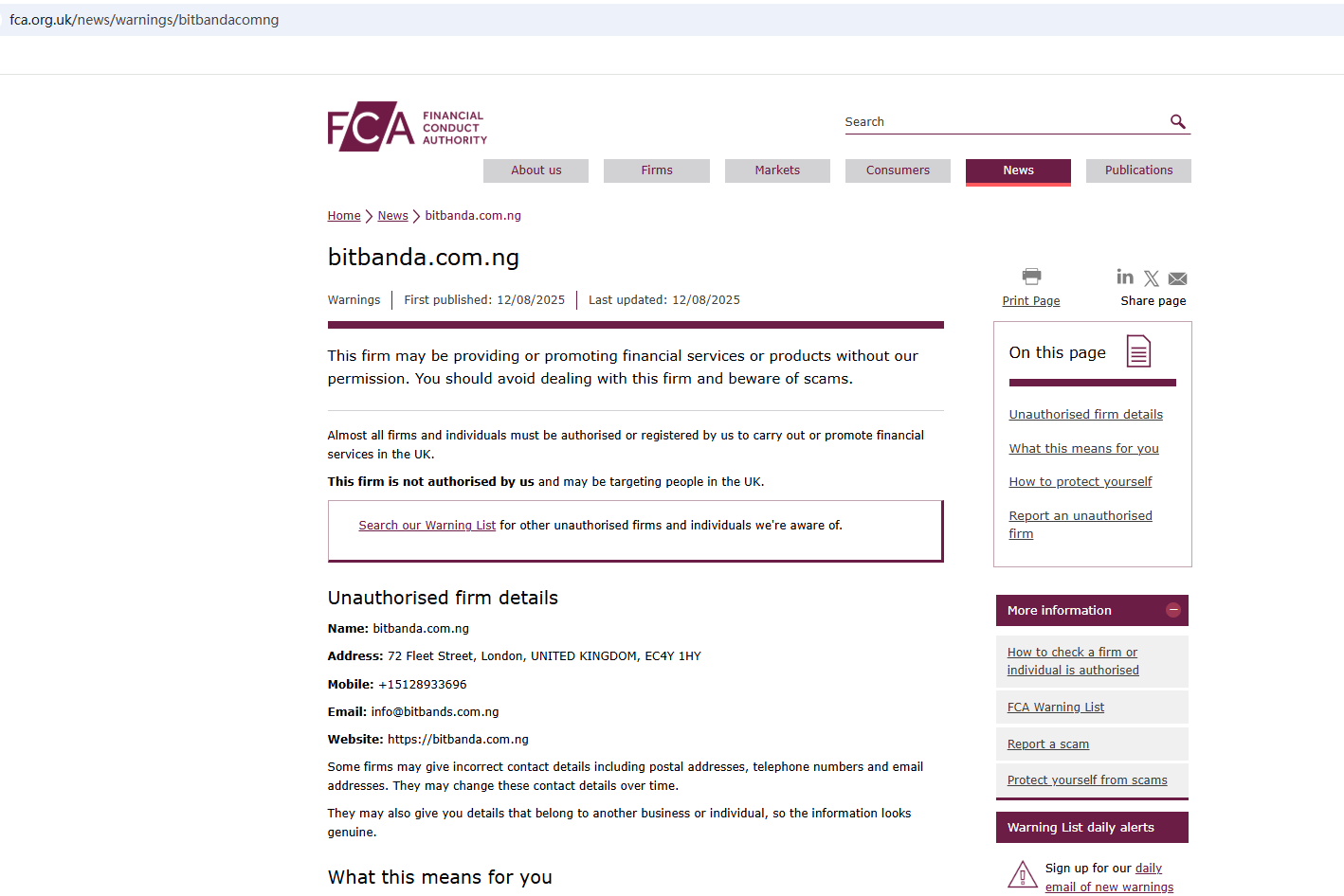 - Aug 11, 2025 The FCA issues a warning against Bitband LTDOn Aug 12, 2025, the Financial Conduct Authority (FCA) issued a warning against Bitband LTD, believing this company might be providing financial services or products without proper authorization. https://www.fca.org.uk/news/warnings/bitbandacomng