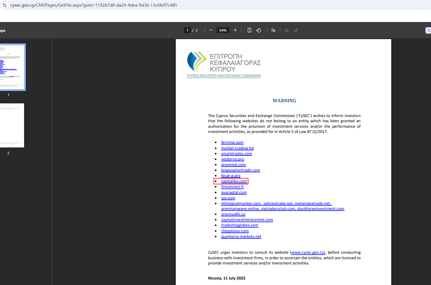 • Jul 10, 2025 The CySEC issued a Warning against CapitalikoOn July 11, 2025, the Cyprus Securities and Exchange Commission (CySEC) issued a warning against Capitaliko, believing this company might be providing financial services or products without authorisation. You may visit: https://www.cysec.gov.cy/CMSPages/GetFile.aspx?guid=1192b7d8-da24-4dea-9d36-13c6fe97c485See less