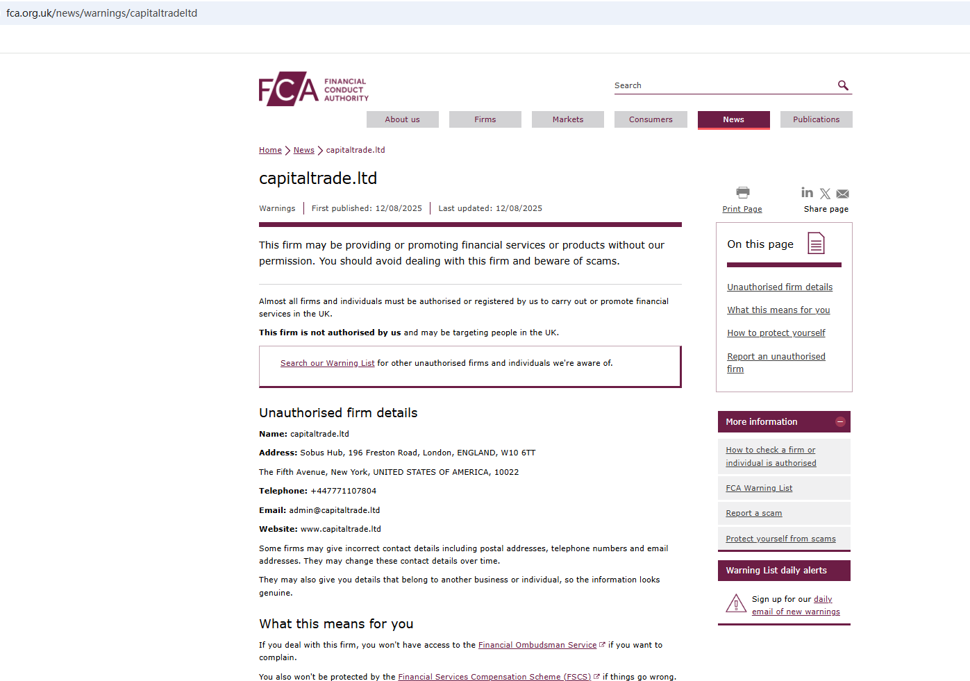 - Aug 11, 2025 The FCA issues a warning against capitaltrade.ltd