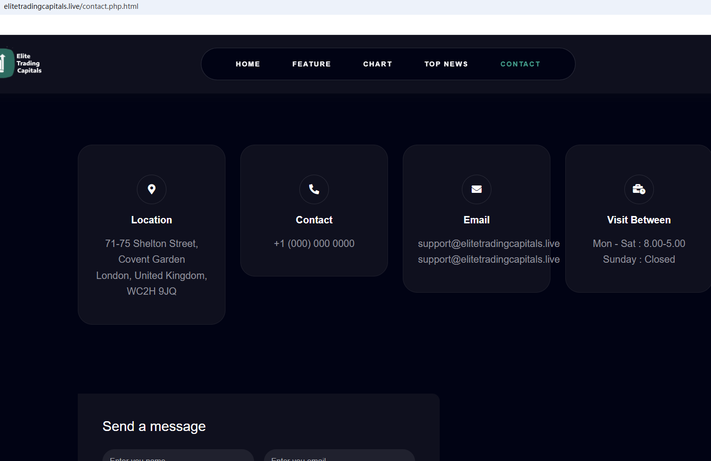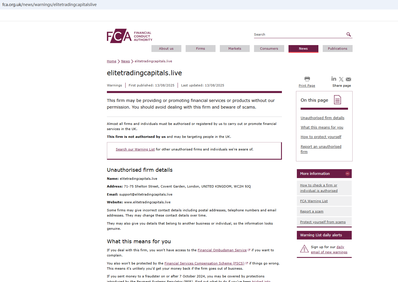 • Aug 27, 2025 BrokersView has found that elitetradingcapitals.live appears to be a scamAccording to its website, it is located in the UK. Upon investigation, we discovered that the Financial Conduct Authority (FCA) issued a warning against elitetradingcapitals.live, believing this company might be providing financial services or products without proper authorization.In essence, elitetradingcapitals.live is not regulated by any governing body. Entrusting it with investors’ funds is highly risky, as there are no legal protections in place to safeguard the funds. elitetradingcapitals.live appears to be a scam.