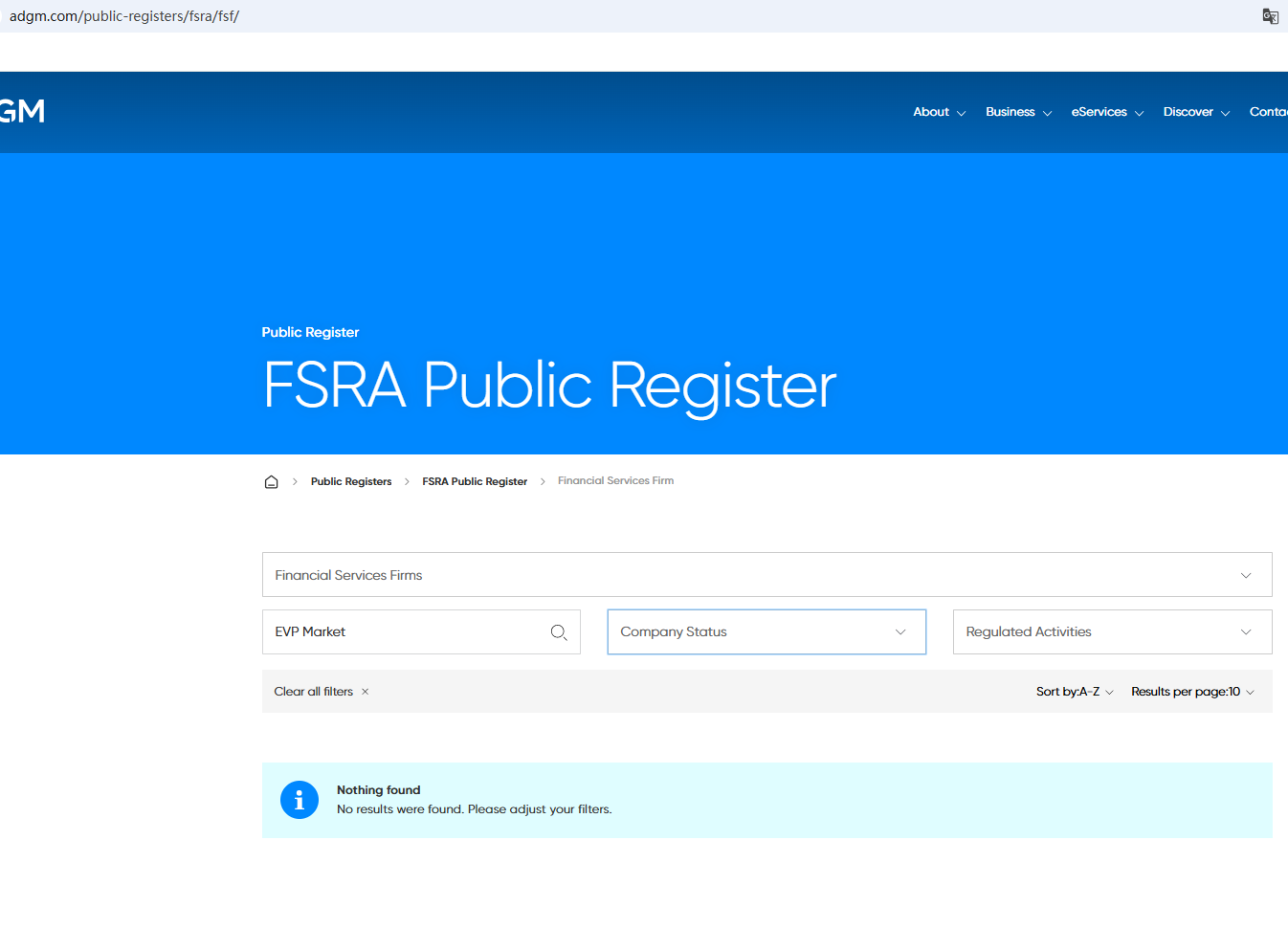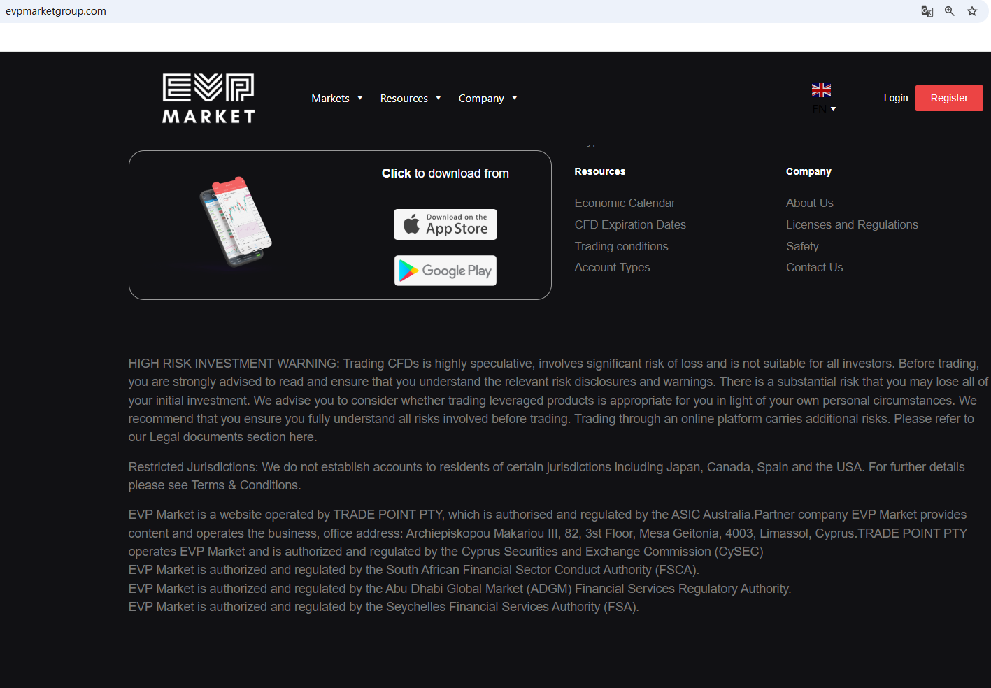 - Aug 31, 2025 BrokersView has reviewed that EVP Market is an unregulated brokerAccording to its website, it claims to be regulated by multiple regulatory bodies. Upon investigation, no matching information was found in the Australian Securities and Investments Commission (ASIC), the Abu Dhabi Global Market (ADGM), the South African Financial Sector Conduct Authority (FSCA). In addition, the Cyprus Securities and Exchange Commission (CySEC) issued a warning against EVP Market, believing this company might be providing financial services or products without authorisation.In essence, EVP Market is not regulated by any governing body. Entrusting it with investors’ funds is highly risky, as there are no legal protections in place to safeguard the funds. EVP Market appears to be a scam.