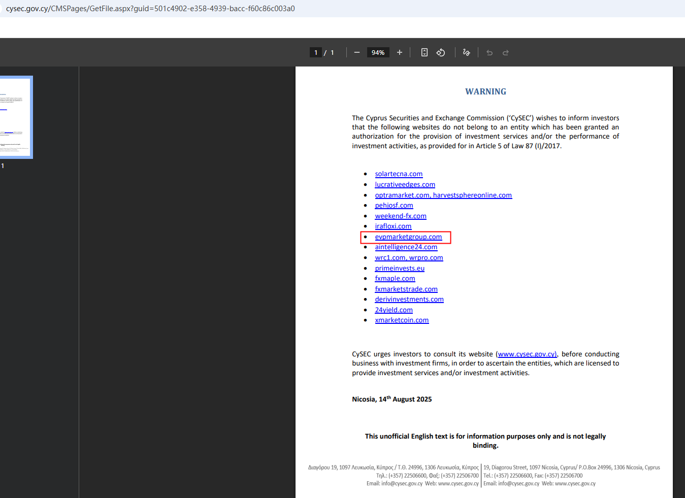 - Aug 13, 2025 The CySEC issued a Warning against EVP MarketOn Aug 14, 2025, the Cyprus Securities and Exchange Commission (CySEC) issued a warning against EVP Market, believing this company might be providing financial services or products without authorisation. You may visit: https://www.cysec.gov.cy/CMSPages/GetFile.aspx?guid=501c4902-e358-4939-bacc-f60c86c003a0