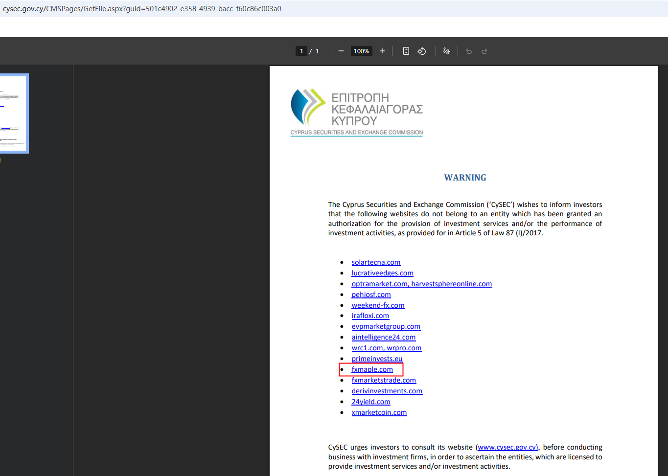 • Aug 13, 2025 The CySEC issued a Warning against FxmapleOn Aug 14, 2025, the Cyprus Securities and Exchange Commission (CySEC) issued a warning against Fxmaple, believing this company might be providing financial services or products without authorisation. You may visit: https://www.cysec.gov.cy/CMSPages/GetFile.aspx?guid=501c4902-e358-4939-bacc-f60c86c003a0See less
