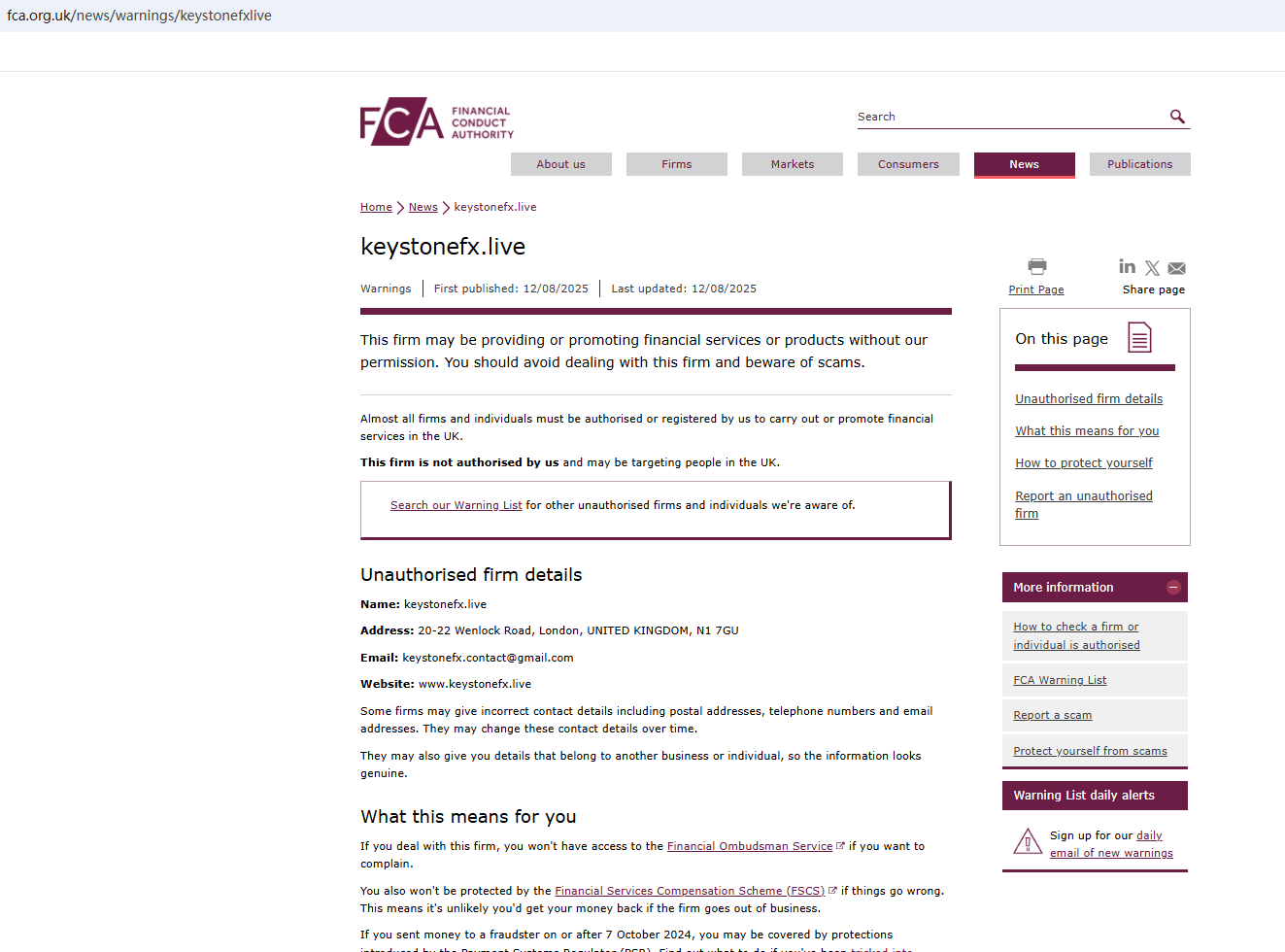 • Aug 11, 2025 The FCA issues a warning against Keystone FxOn Aug 12, 2025, the Financial Conduct Authority (FCA) issued a warning against Keystone Fx, believing this company might be providing financial services or products without proper authorization.Β https://www.fca.org.uk/news/warnings/keystonefxliveSee less