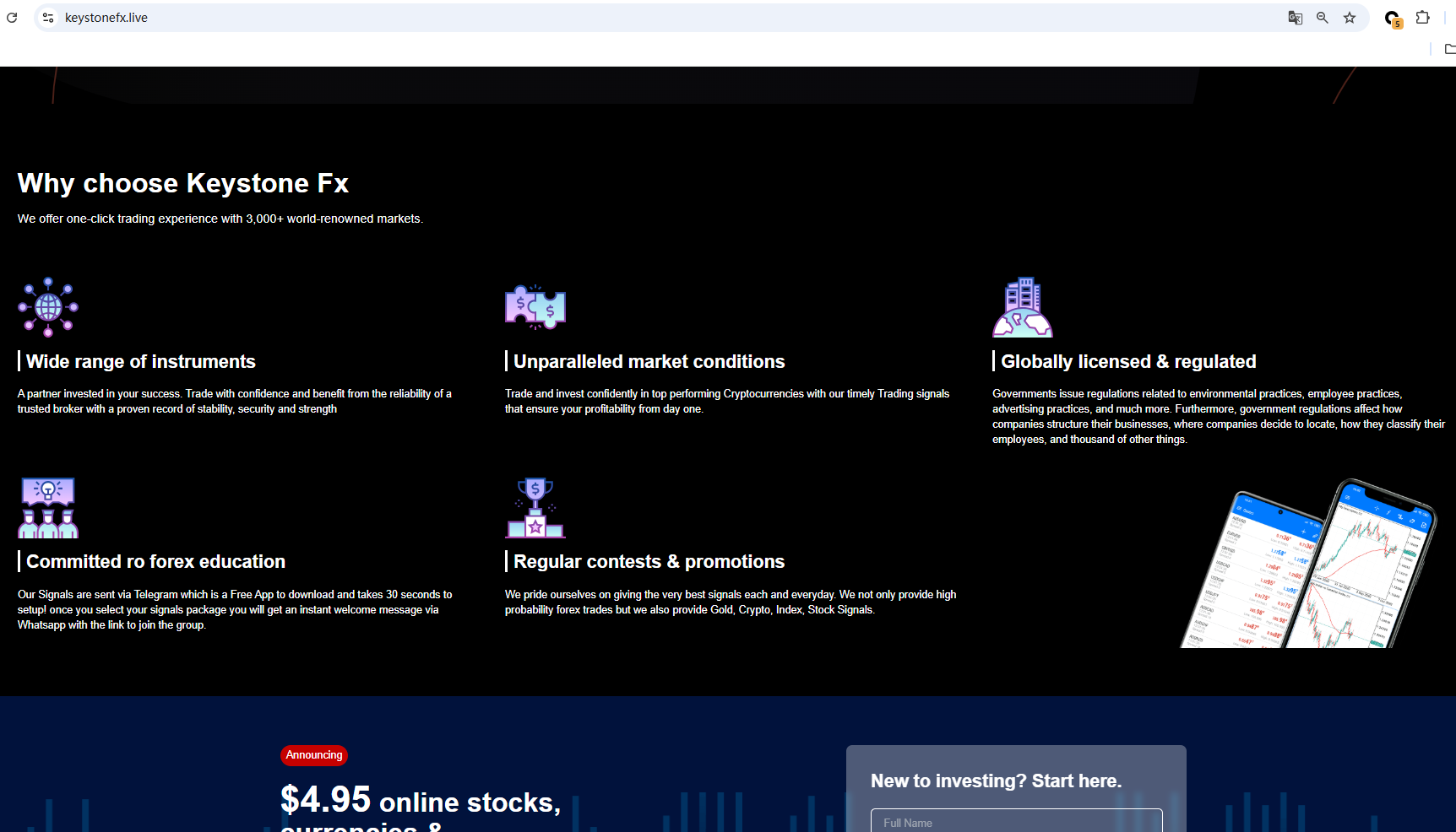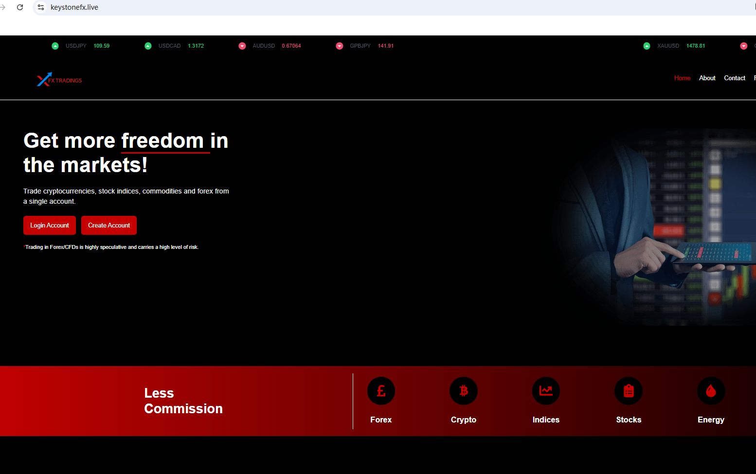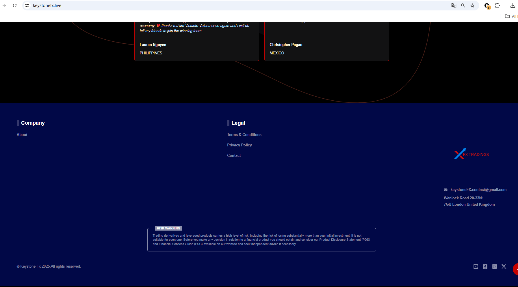 • Aug 27, 2025 BrokersView has found that Keystone Fx appears to be a scamThis website uses a common scam template and has been flagged multiple times by Brokersview. Similar websites often share similar web design and sales pitches, so investors should stay away. The company claims to be globally regulated, but fails to display any valid regulatory information on its website. While it states its address is in the UK, our inquiries revealed that the the Financial Conduct Authority (FCA) issued a warning against Keystone Fx, believing this company might be providing financial services or products without proper authorization.In essence, Keystone Fx is not regulated by any governing body. Entrusting it with investors’ funds is highly risky, as there are no legal protections in place to safeguard the funds. Keystone Fx appears to be a scam.
