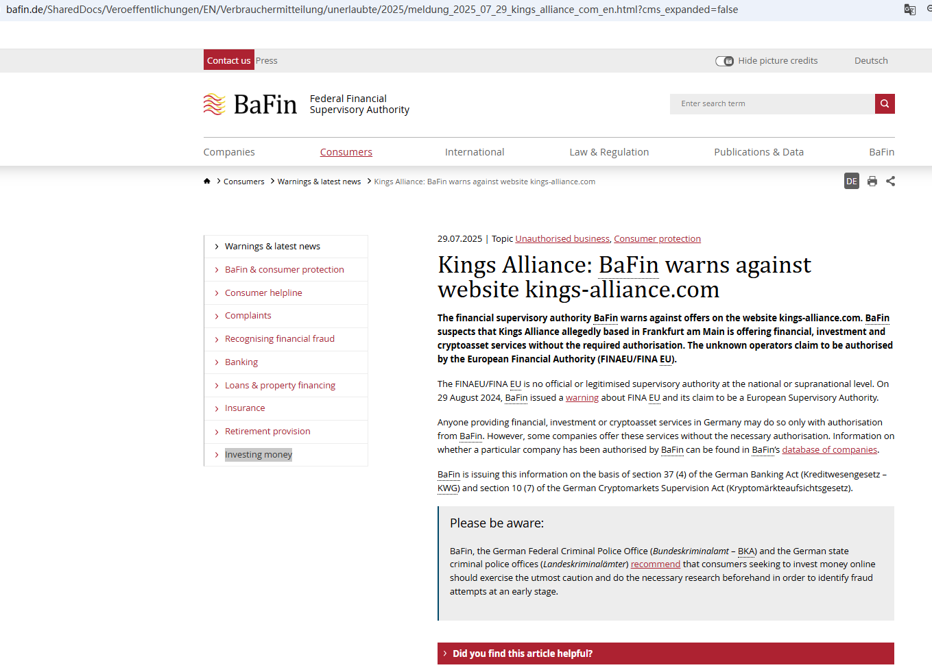 - Jul 28, 2025 The BaFin issues a warning against Kings AllianceOn July 29, 2025, the Federal Financial Supervisory Authority (BaFin) issued a warning against Kings Alliance for the lack of the required authorization.Β https://www.bafin.de/SharedDocs/Veroeffentlichungen/EN/Verbrauchermitteilung/unerlaubte/2025/meldung_2025_07_29_kings_alliance_com_en.html?cms_expanded=false