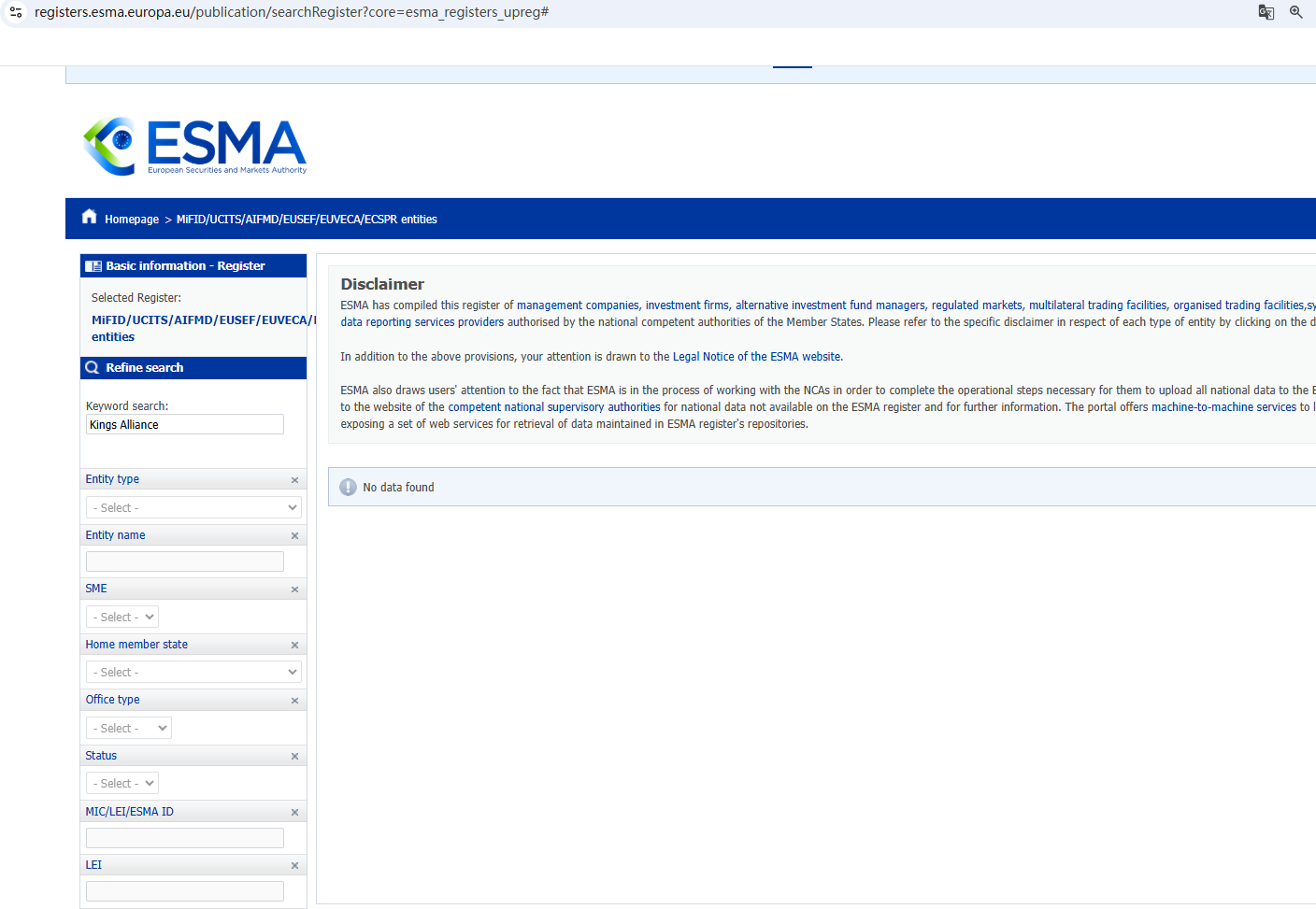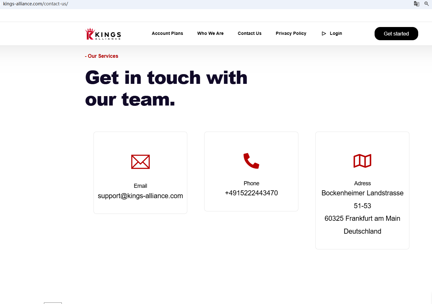 - 21 hours ago BrokersView has reviewed that Kings Alliance is an unregulated brokerAccording to its website, it claims to be an authorized firm. However, no matching information was found with the European Securities and Markets Authority. Furthermore, the Federal Financial Supervisory Authority (BaFin) issued a warning against Kings Alliance for the lack of the required authorization.In essence, Kings Alliance is not regulated by any governing body. Entrusting it with investors’ funds is highly risky, as there are no legal protections in place to safeguard the funds. Kings Alliance appears to be a scam.
