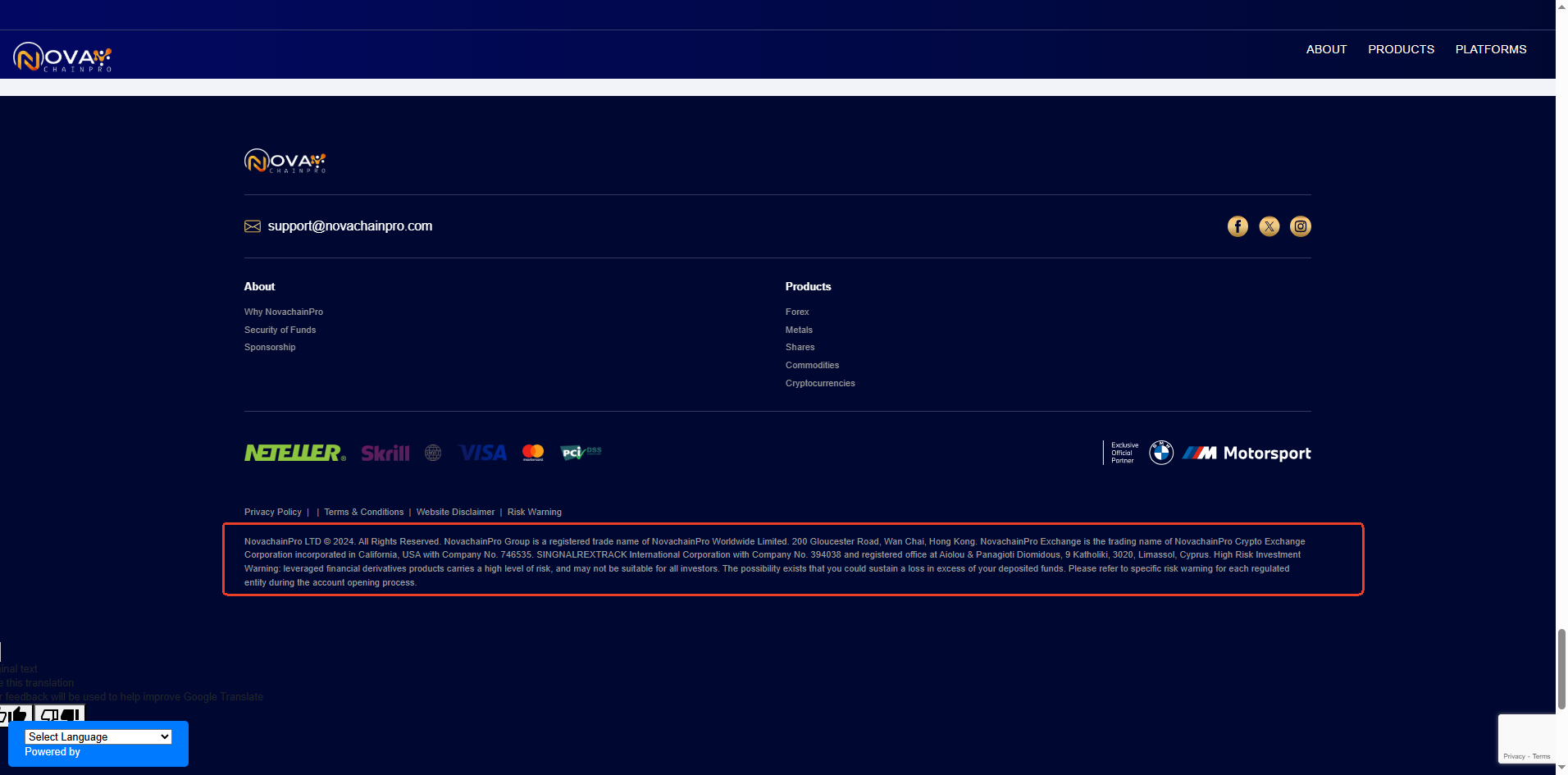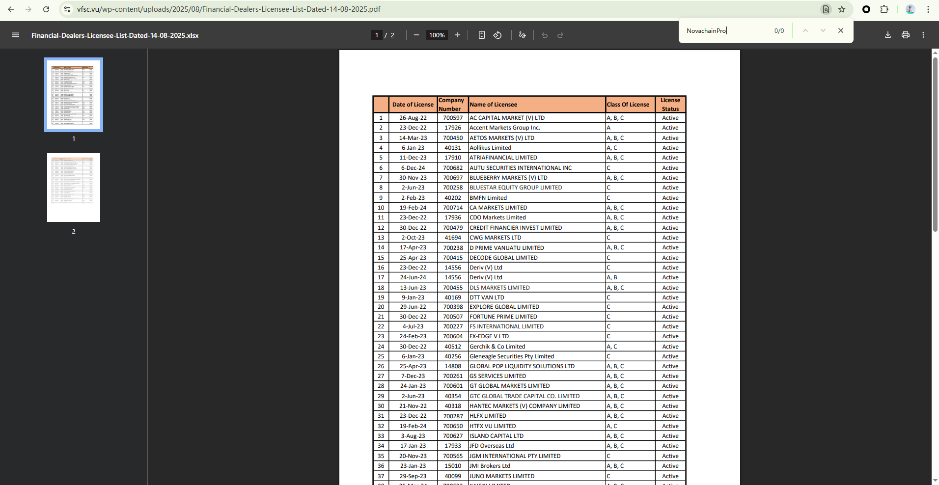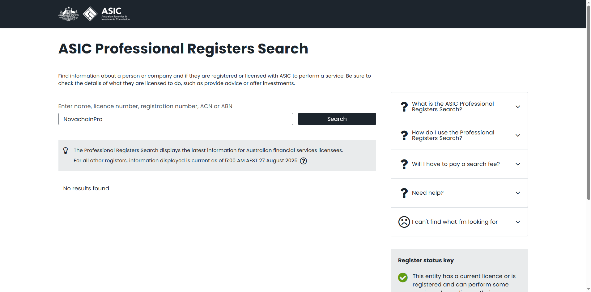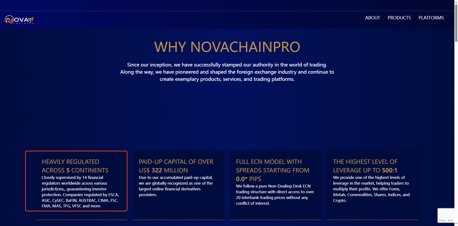 • Aug 26, 2025 BrokersView has found that NovachainPro appears to be a scamNovachainPro appears to be a highly suspicious trading platform, potentially involved in fraudulent activities. The platform claims to be authorized and regulated by multiple financial authorities across five continents, including prominent institutions such as the UAE’s SCA, ASIC, CySEC, BaFIN, CIMA, FSC, FMA, MAS, and VFSC.However, upon thorough investigation, we have been unable to find any record of NovachainPro registered with or supervised by any of these regulatory bodies. This significant discrepancy strongly suggests that the platform has deliberately fabricated its regulatory credentials to mislead investors.Given this evidence, NovachainPro exhibits clear signs of deceptive practices and poses an extremely high risk of fraud.Β