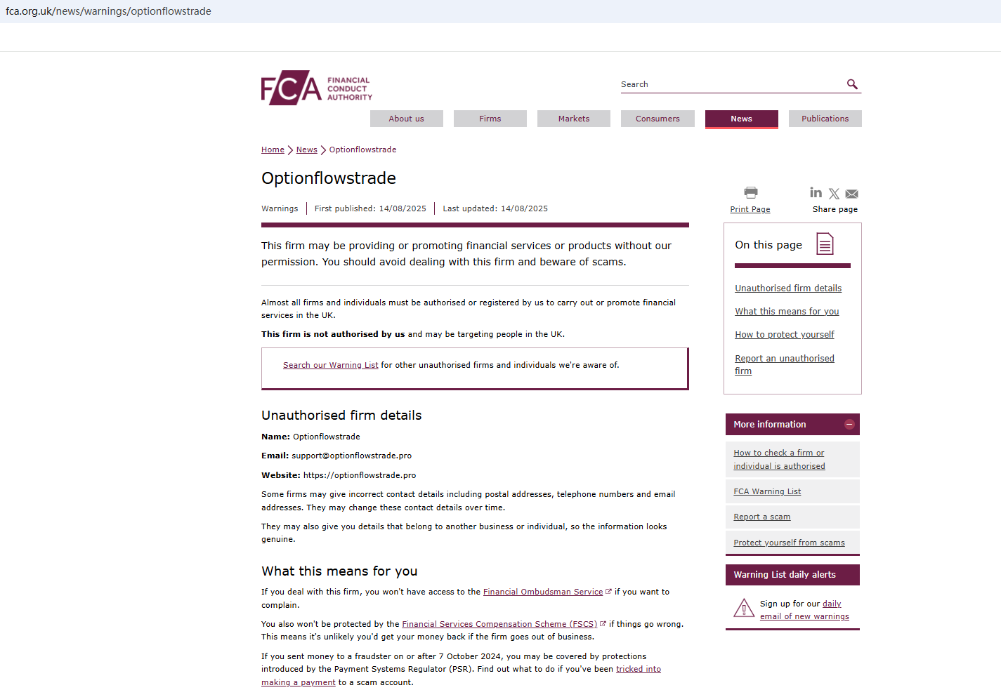• Aug 13, 2025 The FCA issues a warning against OptionflowstradeOn Aug 14, 2025, the Financial Conduct Authority (FCA) issued a warning against Optionflowstrade, believing this company might be providing financial services or products without proper authorization.Β https://www.fca.org.uk/news/warnings/optionflowstradeSee less