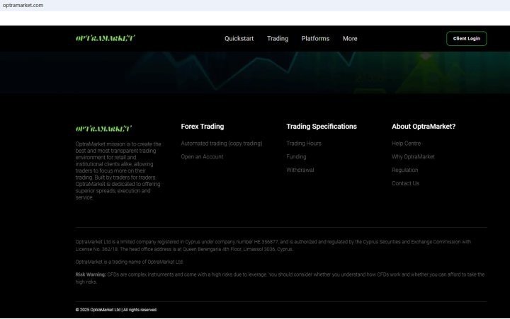 - Aug 28, 2025 BrokersView has reviewed that OptraMarket is an unregulated brokerIts website claims that the company was established in Cyprus in 2018 and is regulated by thr Cyprus Securities and Exchange Commission (CySEC). Upon investigation, we discovered that its domain name was not created until 2025, clearly contradicting the facts. Even more ridiculous, the Cyprus Securities and Exchange Commission (CySEC) issued a warning against OptraMarket, believing this company might be providing financial services or products without authorisation.In essence, OptraMarket is not regulated by any governing body. Entrusting it with investors’ funds is highly risky, as there are no legal protections in place to safeguard the funds. OptraMarket appears to be a scam.