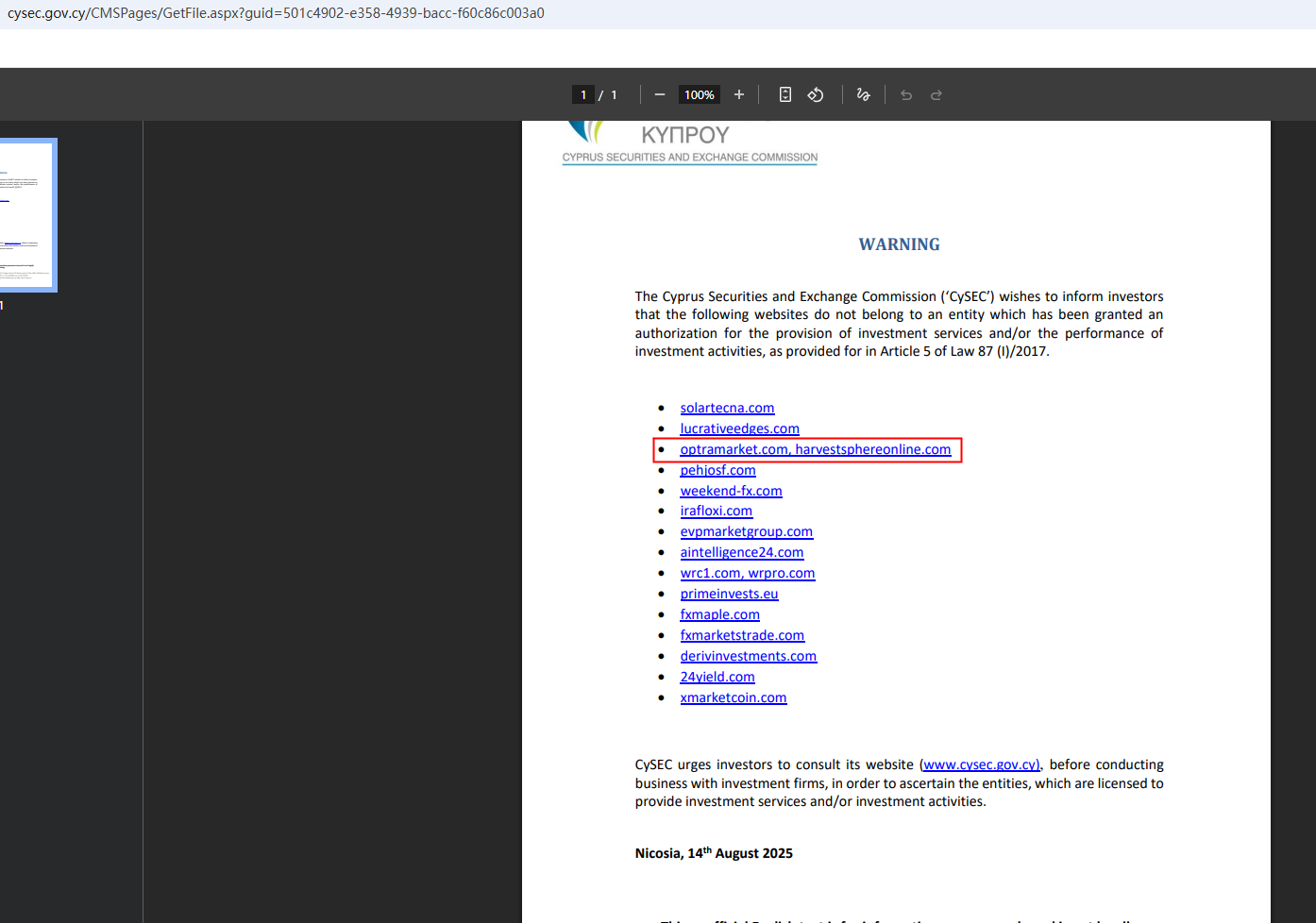 - Aug 13, 2025 The CySEC issued a Warning against OptraMarketOn Aug 14, 2025, the Cyprus Securities and Exchange Commission (CySEC) issued a warning against OptraMarket, believing this company might be providing financial services or products without authorisation. You may visit: https://www.cysec.gov.cy/CMSPages/GetFile.aspx?guid=501c4902-e358-4939-bacc-f60c86c003a0