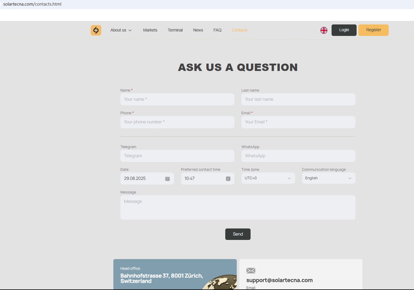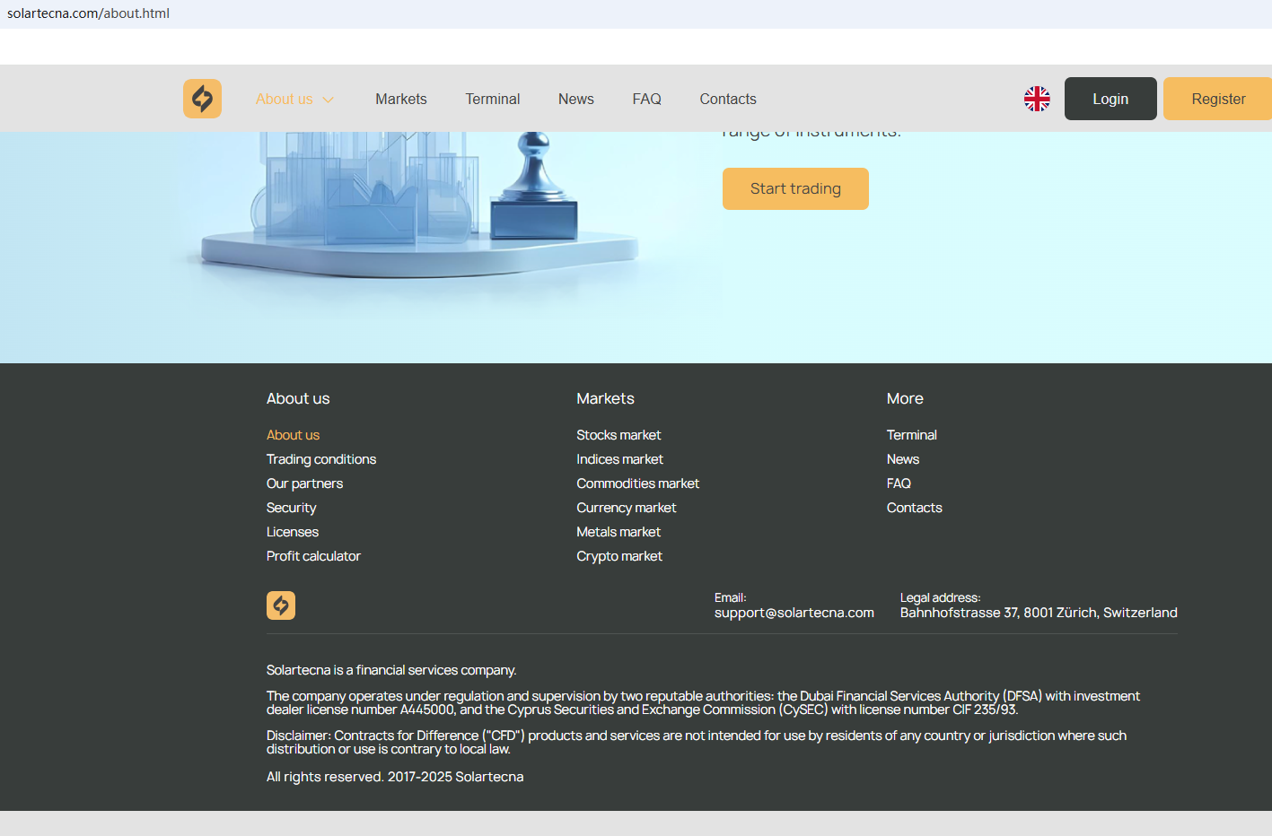 • Aug 28, 2025 BrokersView has reviewed that Solartecna is an unregulated brokerThe website claims regulation by both the Dubai Financial Services Authority (DFSA) and the Cyprus Securities and Exchange Commission (CySEC). However, no matching information was found with the DFSA. Furthermore, CySEC issued a warning against Solartecna, stating the company might be providing financial services or products without authorisation.In essence, Solartecna is not regulated by any governing body. Entrusting it with investors’ funds is highly risky, as there are no legal protections in place to safeguard the funds. Solartecna appears to be a scam.