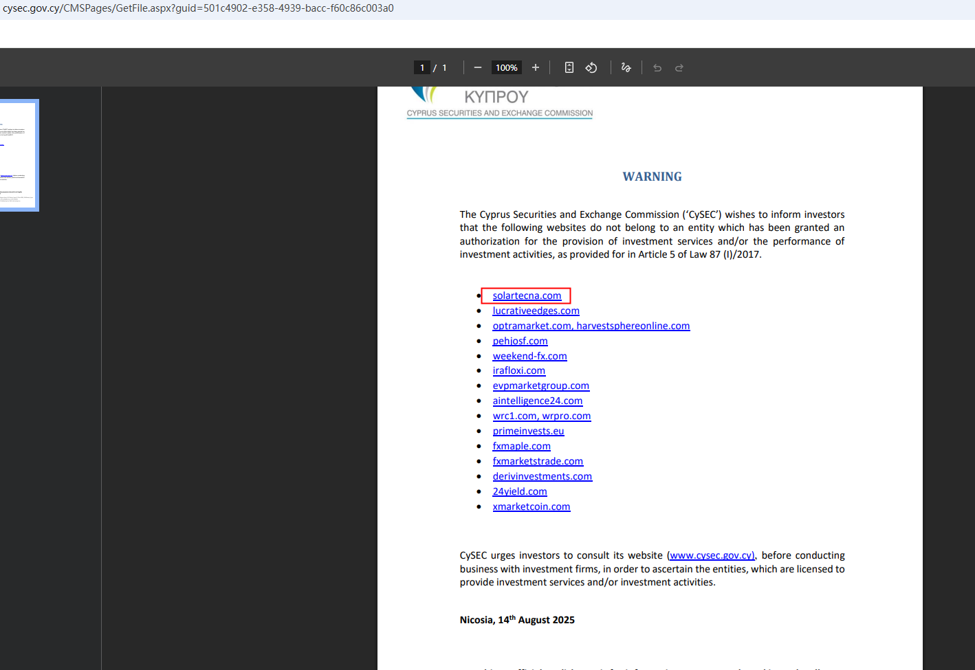 • Aug 13, 2025 The CySEC issued a Warning against SolartecnaOn Aug 14, 2025, the Cyprus Securities and Exchange Commission (CySEC) issued a warning against Solartecna, believing this company might be providing financial services or products without authorisation. You may visit: https://www.cysec.gov.cy/CMSPages/GetFile.aspx?guid=501c4902-e358-4939-bacc-f60c86c003a0See less