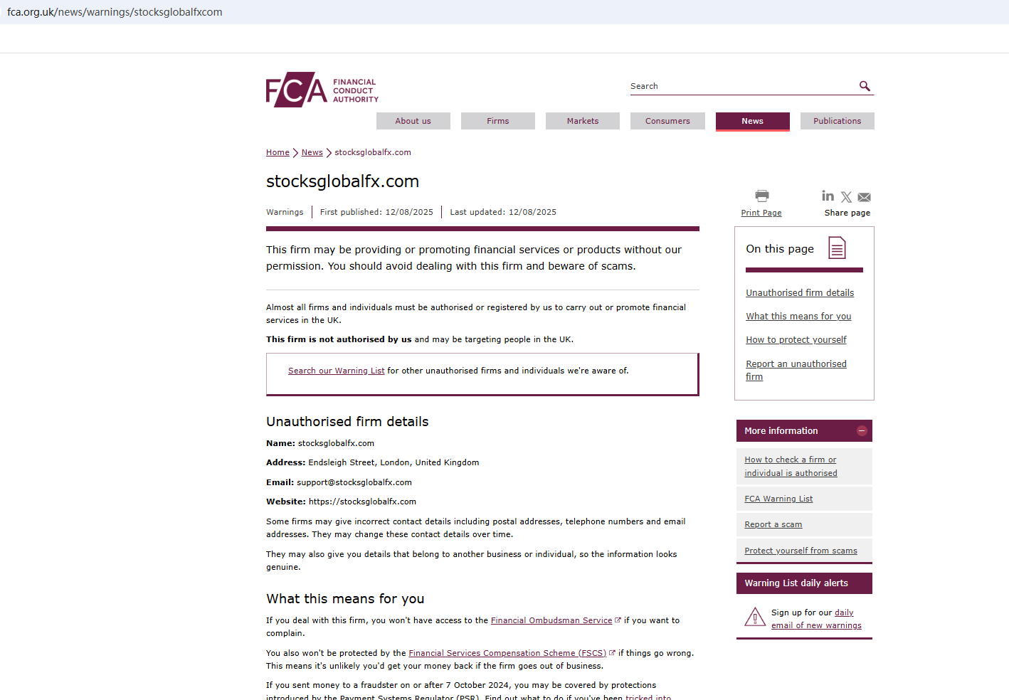 - Aug 11, 2025 The FCA issues a warning against Stocksglobalfx LTDOn Aug 12, 2025, the Financial Conduct Authority (FCA) issued a warning against Stocksglobalfx LTD, believing this company might be providing financial services or products without proper authorization.Β https://www.fca.org.uk/news/warnings/stocksglobalfxcom